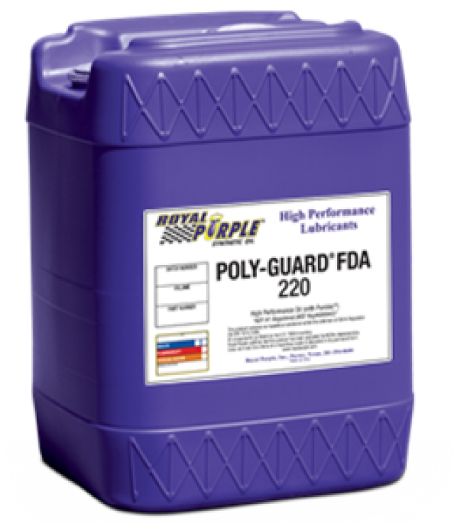 Poly-Guard használata ajánlott, kompresszorok, szivattyúk, hajtóművek, csapágyak és szinte minden más élelmiszer-feldolgozó és gyógyszeripari üzemek olajt igénylő berendezéseikhez.Poly-Guard FDA – egy kiváló, kopásgátló, hosszú élettartamú, szintetikus kenőanyag, amely USDA H-1 jóváhagyással rendelkezik, és megfelel az FDA Title 21 CFR § 178,3620 (b) a tisztasági követelménynek.Poly-Guard FDA a Royal Purple saját fejlesztésű Purolec ® adalék technológiat alkalmazza, amely bizonyítottan csökkenti a kopást, és folyamatosan tisztán tartja berendezéseket, amely lehetővé teszi a lényegesen hosszabb olajcsere időtartamot.
